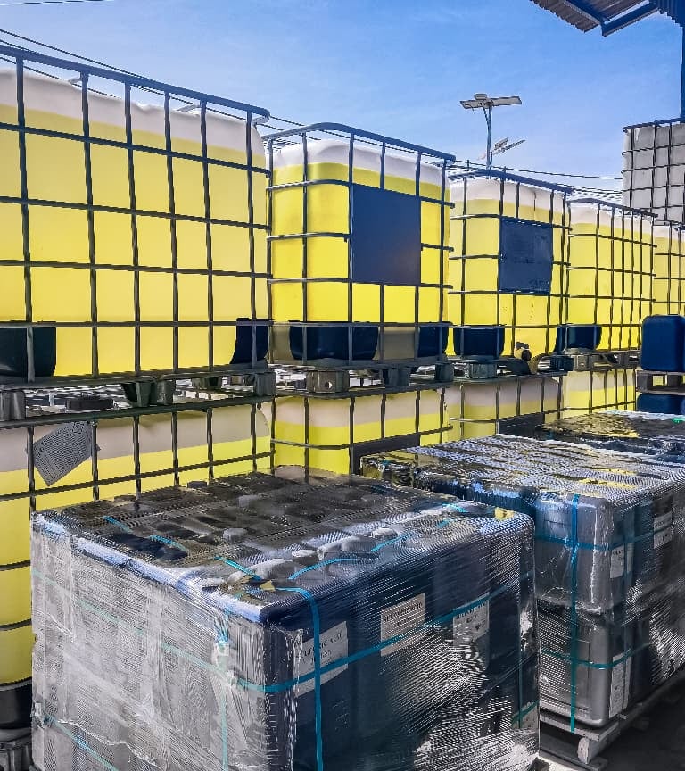Documentation of various chemical products we supply, carefully packaged in IBC tanks, drums, and jerry cans — along with a wide range of other quality products to support your industrial needs