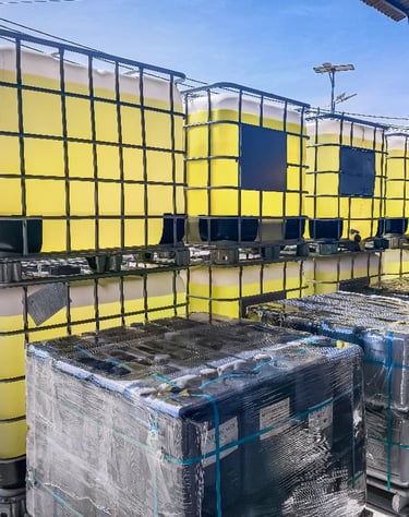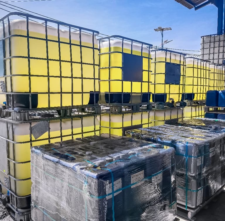 Documentation of various chemical products we supply, carefully packaged in IBC tanks, drums, and jerry cans — along with a wide range of other quality products to support your industrial needs